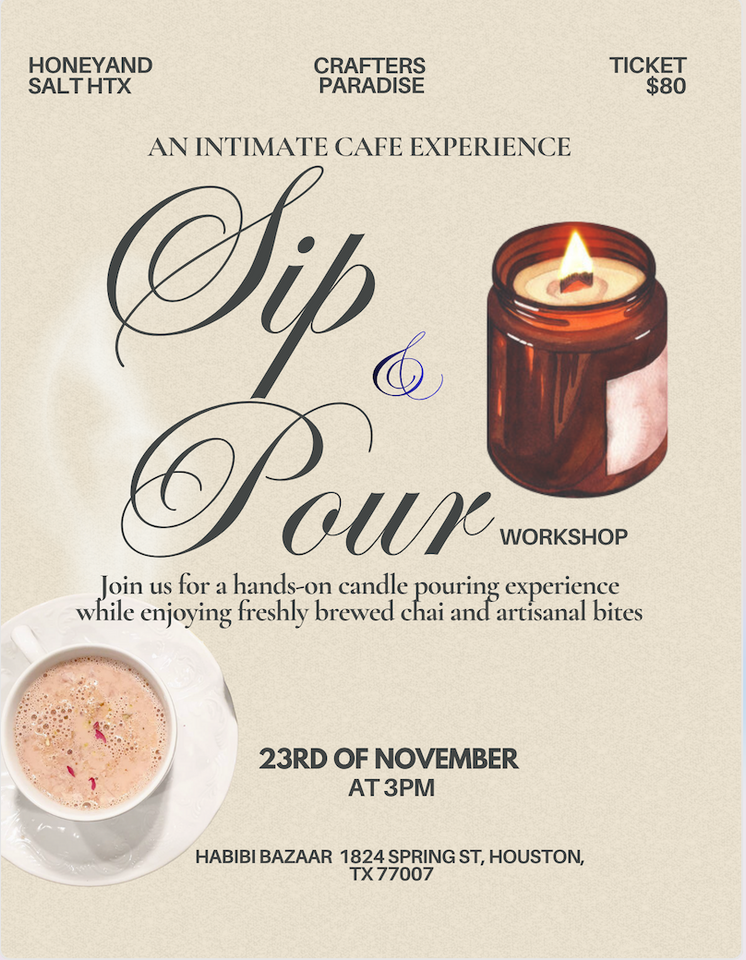 Step into a cozy, intimate cafe-inspired experience at Habibi Bazaar for our Sip & Pour Workshop, hosted in collaboration with Crafters Paradise and Honey and Salt HTX. Enjoy an afternoon of creativity as you hand-pour your own custom candle while sipping freshly brewed chai and savoring artisanal bites.